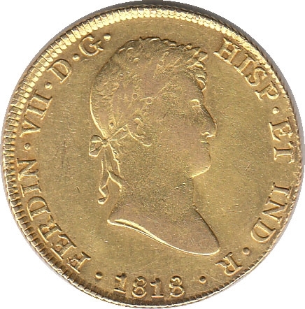 1818 FERNANDO VII, 8 Escudos. Lima. JP. ( A.C.1765 ). 27 gramos. Floja acuñación en escudo del reverso. MBC-