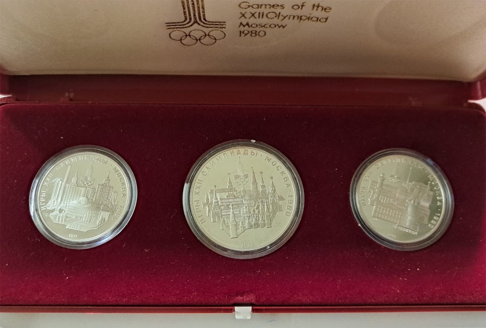 1977 RUSIA. JJOO Moscú'80. Estuche 3 piezas: 10+5+5 Rublos. Vistas de Moscu, Kiev y Lenningrado. Peso de 66,64 gramos y una pureza de 900 milésimas, plata pura 59,94 gramos. Presentadas en estuche. PROOF