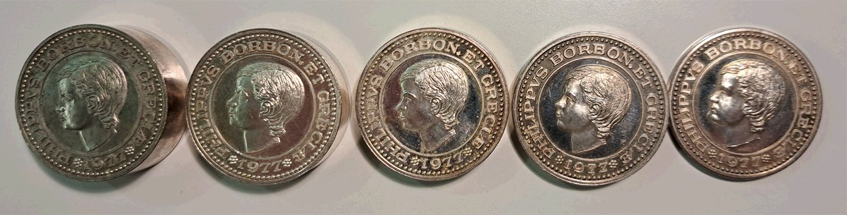 1977. Ducatón de FELIPE. Homenaje al Principe. Juego completo de 5 piezas 1, 2, 3, 4 y 5 Ducatones. Acuñación en plata de 915 milésimas, reproduciendo un antiguo Ducatón. Pesos de 175 - 140 - 105 - 70 y 35 gramos, que hacen un total de 525 gramos. Piezas sueltas. FDC.
