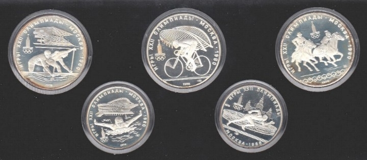 1978 Rusia JJOO Estuche 5 Piezas en plata: 5 rublos Natación y Atletismo, 10 Rublos Canoas, Ciclismo y Equitación. II Serie. Peso de plata 133,24 gramos con pureza de 900 milésimas, plata pura 119,91 gramos. FDC