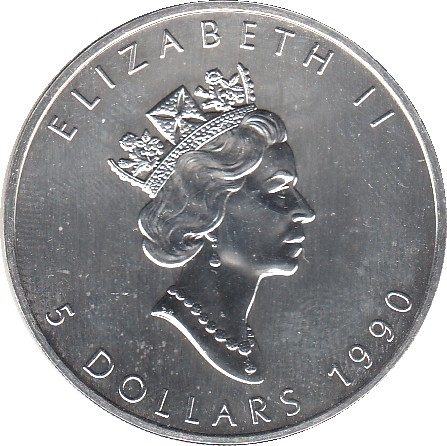 1990 CANADA 5 Dólares - 1 Onza plata Hoja de Arce