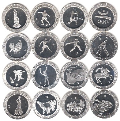 1992 JJOO BCN'92 Juego completo de las 16 piezas en plata. Cuatro piezas de cada serie I - II - III y IV. Presentadas en cajas individuales. PROOF