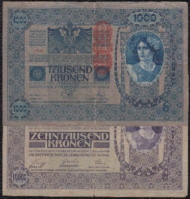Austria. Lote 2 billetes: 1902 1000 coronas y 1918 10.000 coronas.