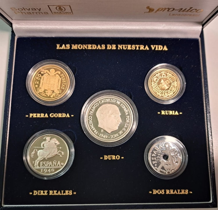 LAS MONEDAS DE NUESTRA VIDA - Reproducción de 5 monedas del ESTADO ESPAÑOL: 10 Cétnimos, 50 Ctmos, 1 pta, 2.5 Ptas y 5 pesetas. Presentadas en estuche, con certificado. Peso de 47,9 gramos y una pureza 999 milésimas. PROOF